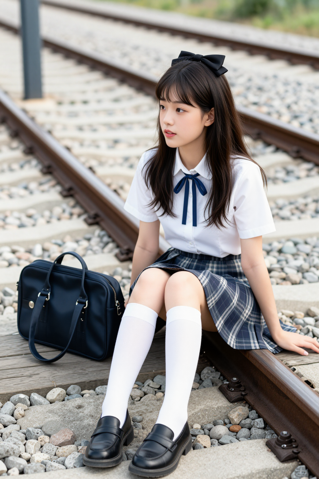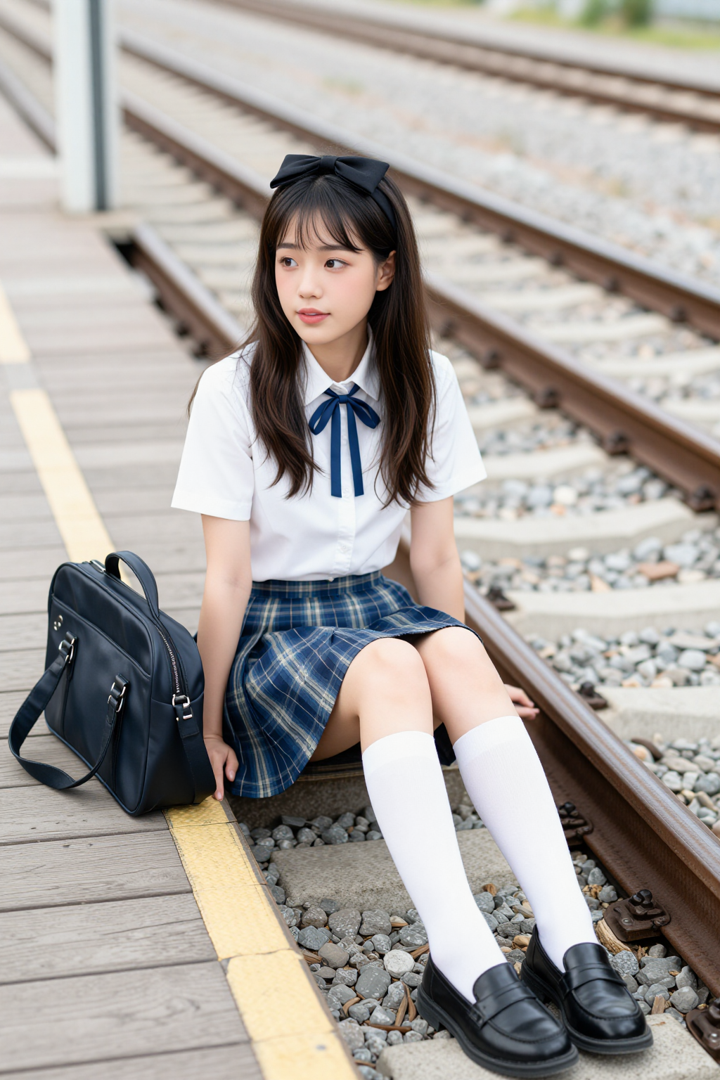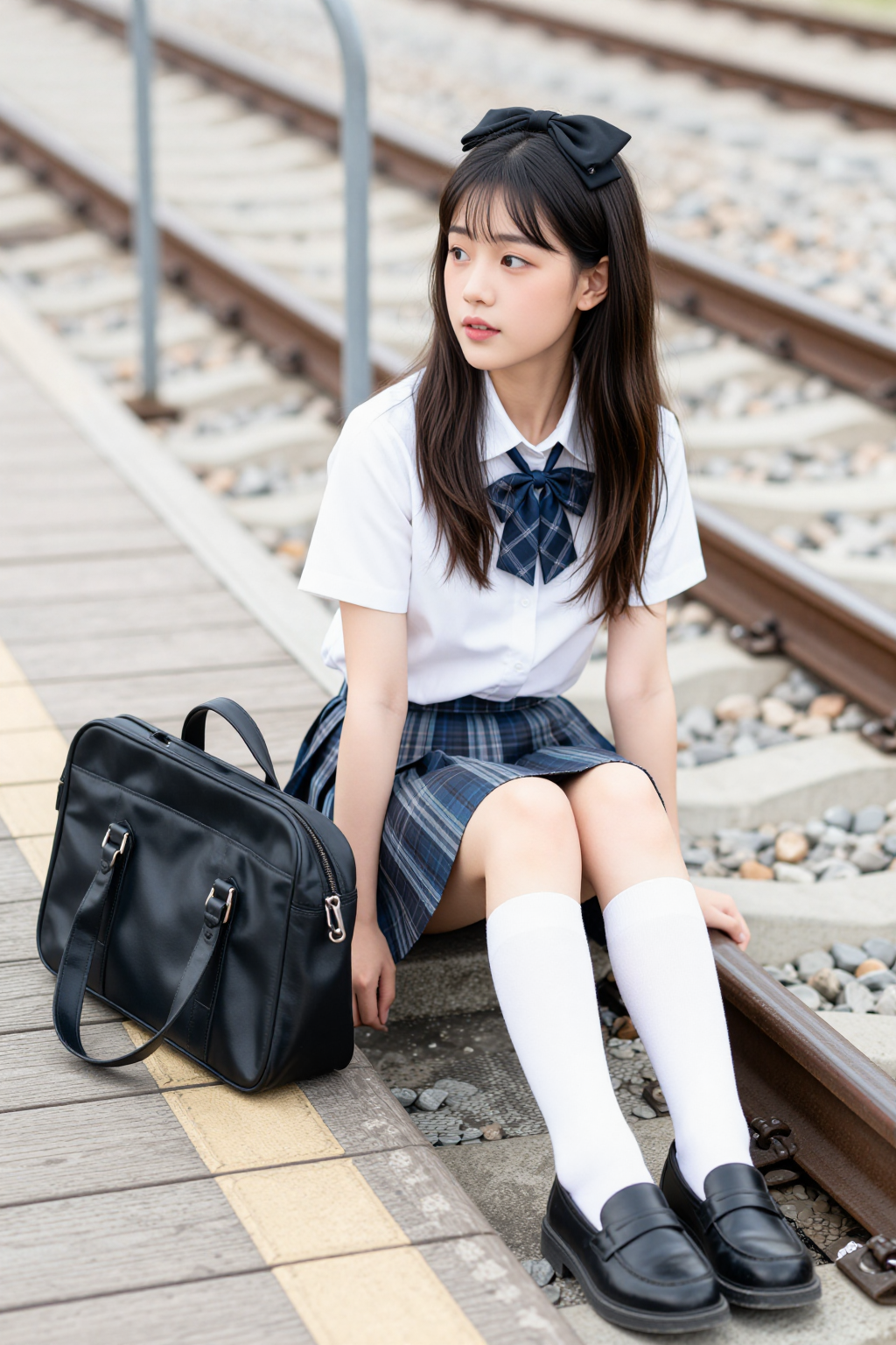 搭配白色中筒袜,既能增加层次感,又能优化腿部比例,让整体造型更显修长。黑色乐福鞋提升了整体造型的质感,同时与格纹元素形成对比,让整体风格更加平衡。深蓝色包包作为配饰,既实用又能提升整体造型的精致度,让整体搭配更具完整性。