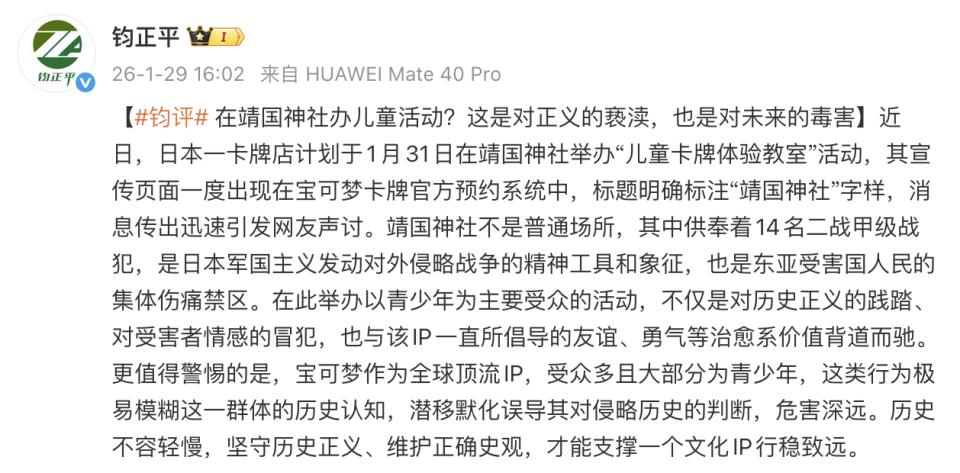 1月29日,钧正平工作室官方微博发文《在靖国神社办儿童活动?这是对正义的亵渎,也是对未来的毒害》。