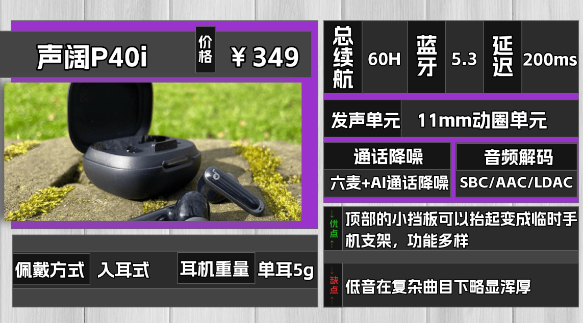 √这款耳机整体比较小巧精致,同时还有手机支架设计,实用性比较强。降噪方面,它配备“前馈+后馈+通话”六麦克风阵列,并搭载自研AI降噪3.0芯片,实测中低频段噪音抑制明显。音质方面采用11mm羊毛纸复合振膜单元,搭配BassUp低频增强技术,低频下潜至20Hz澎湃有力,高频不刺激,中频偏温和,人声情感不够饱满。LDAC高清编解码支持24bit/96kHz无损传输,支持3D全景音效与游戏音效模式,可实现手游低延迟、声画同步体验,满足音乐与游戏双场景需求。