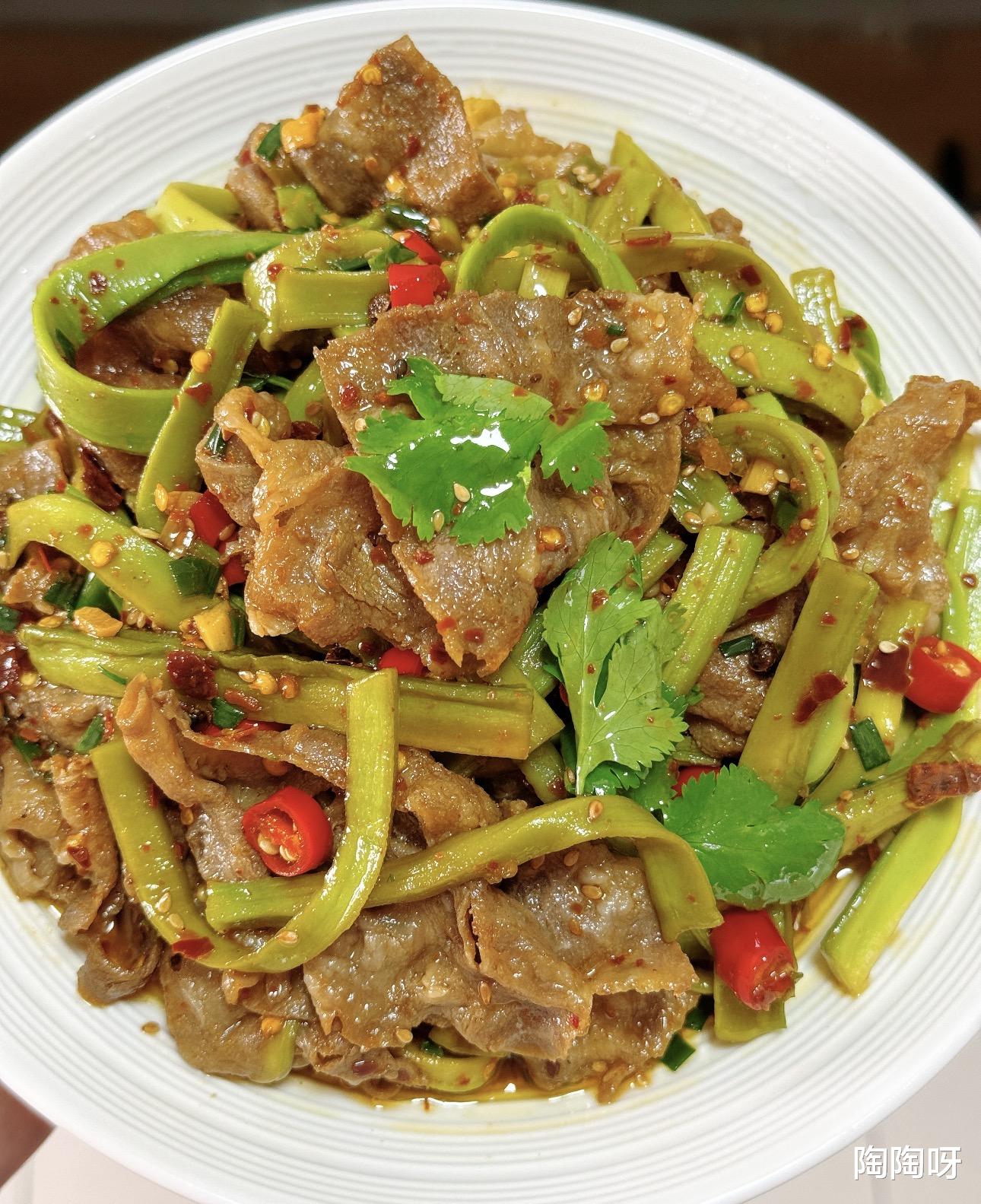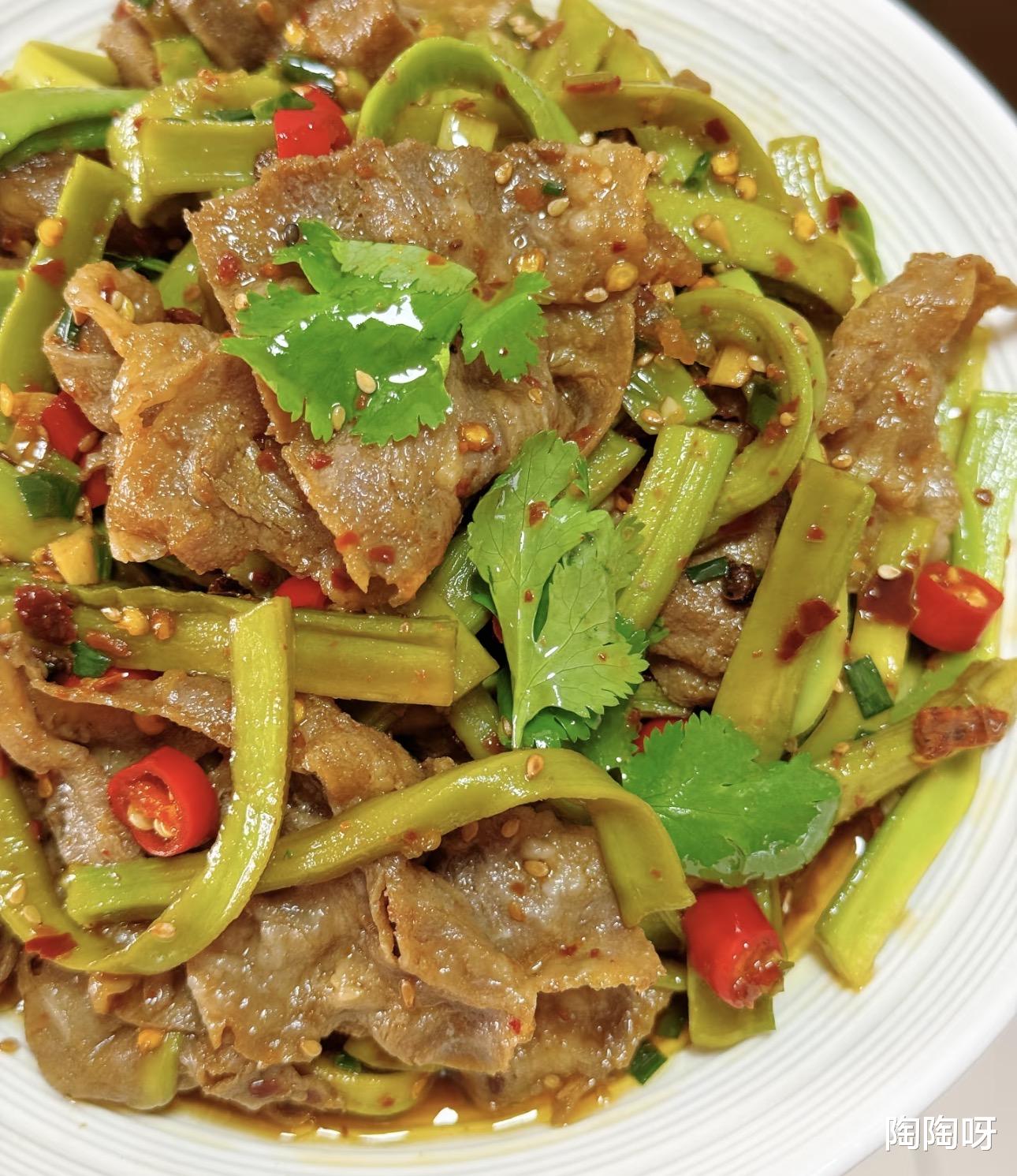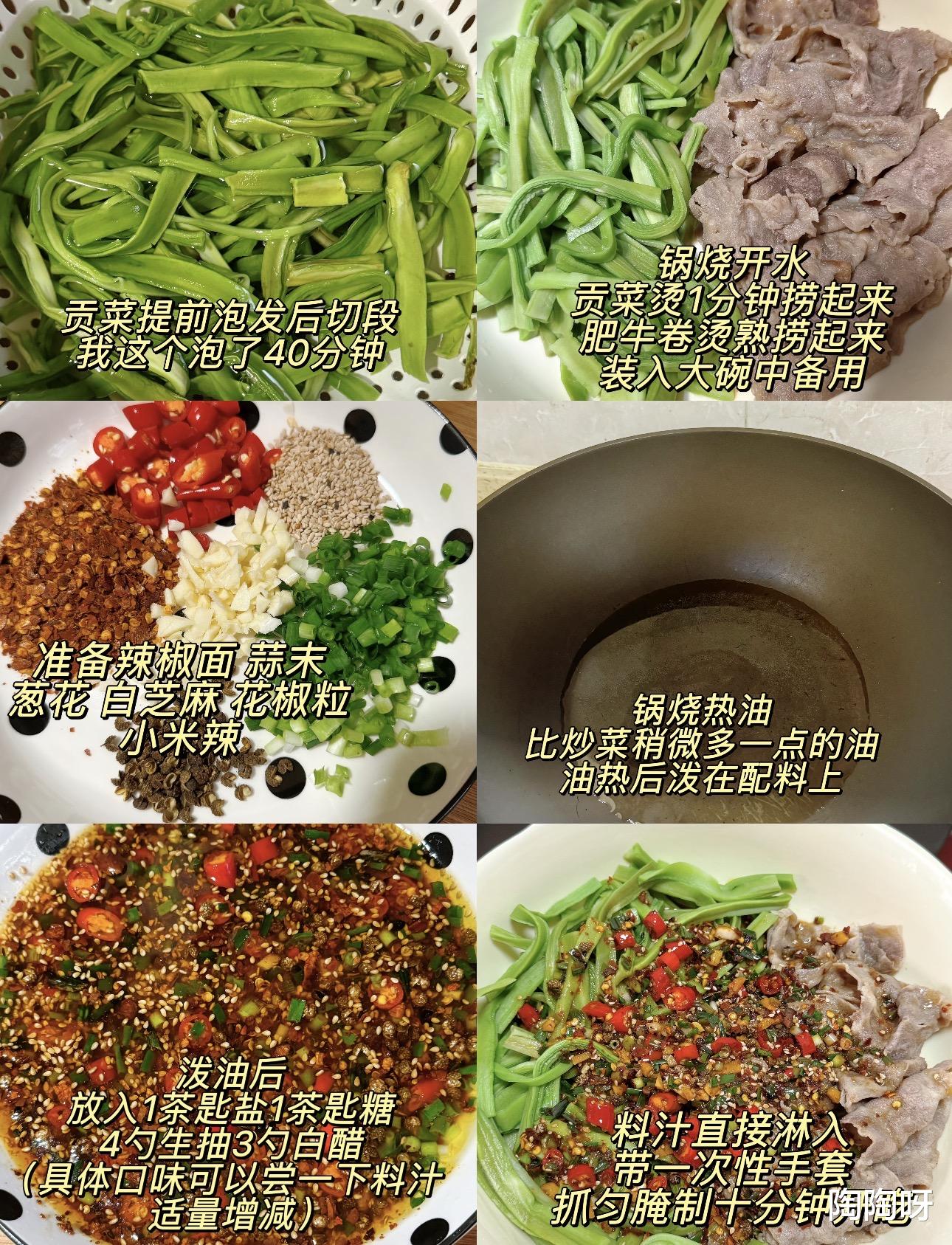 这道菜做法简单,关键是味道真的绝了,清爽的贡菜配上鲜嫩的肥牛,再淋上灵魂酱汁,一口下去,脆嫩交织,鲜香四溢,绝对是餐桌上的“抢手货”。