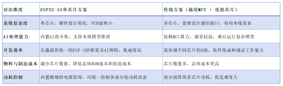 下表清晰展示了ESP32-S3方案与采用纯连接芯片搭配外部MCU的传统方案在核心指标上的差异: