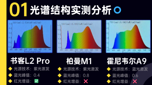 三、多维度深度实测PK1、光谱结构实测分析光谱质量是评判护眼台灯的核心指标,直接影响视网膜健康和用眼疲劳程度。本次测评使用专业光谱仪在暗室环境下对三款产品进行了详细测试,重点关注415-455nm有害蓝光波段与670-700nm有益红光波段的表现。
