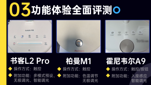 3、功能体验全面评测护眼台灯的功能设计直接影响使用便捷性与场景适应性,本次测评对三款台灯的操作方式、智能功能与场景模式进行测试。
