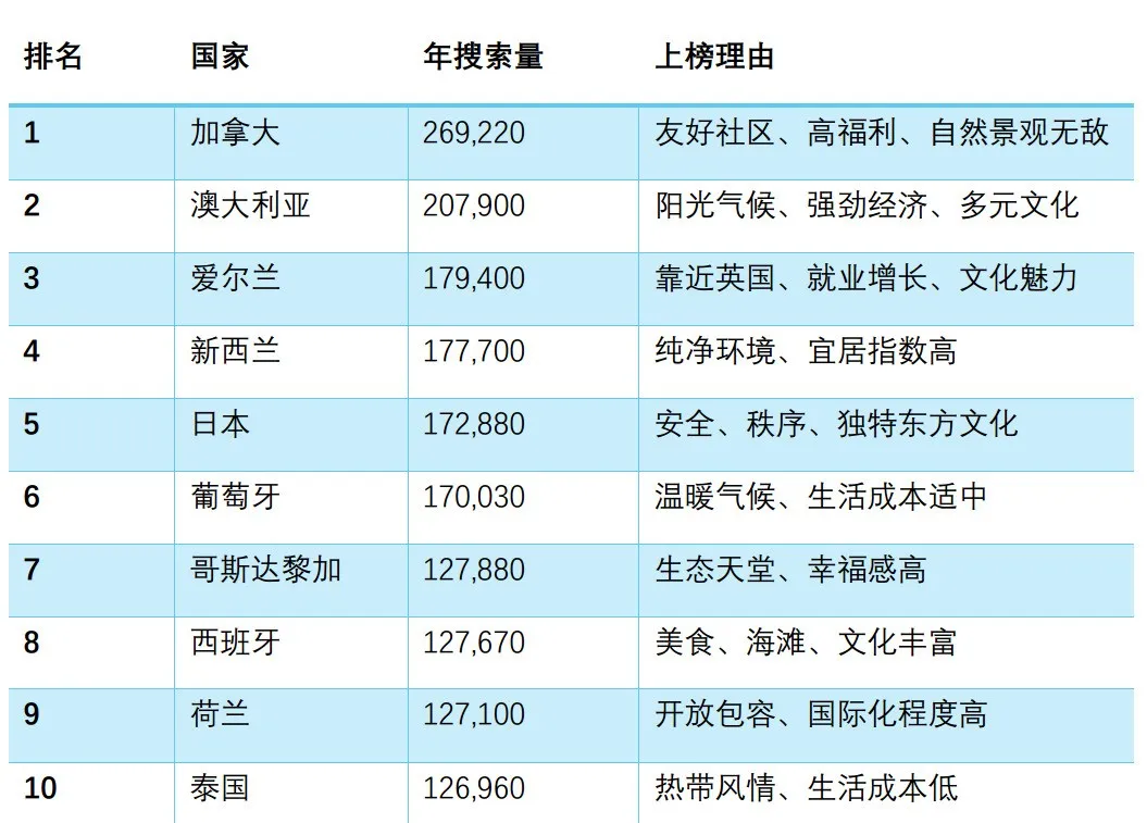 排名概述加拿大连续第二年登顶全球最受欢迎移居国家年搜索量超过26.9万次,在全球 75 个国家中被列为首选目的地。