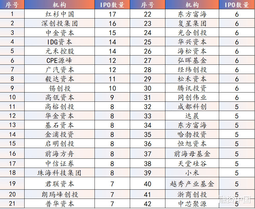 除此之外,IDG资本、元禾控股、CPE源峰、广汽资本、毅达资本、锡创投、高瓴资本跻身IPO数量前十之列。