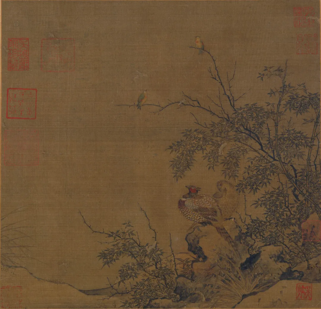 宋室一朝,花鸟翎毛精采,高迈前古,成一代金辉。画工奉格物致知为心法,朝夕临池,静察禽羽,微至丝毫,务令形神双全。纤翎柔劲,风起电掣;振翼回翔,瞬息不失;顾盼啁啾,情态毕呈,写实功力深厚难量。然工写不止停笔端,更于意境铺陈用力。多取幽篁残枝,短岸浅溪,篱落荒汀,为禽鸟栖息幽境,花影摇红,云烟浮翠,使画幅一片清吟暗生,笔底自有诗心。