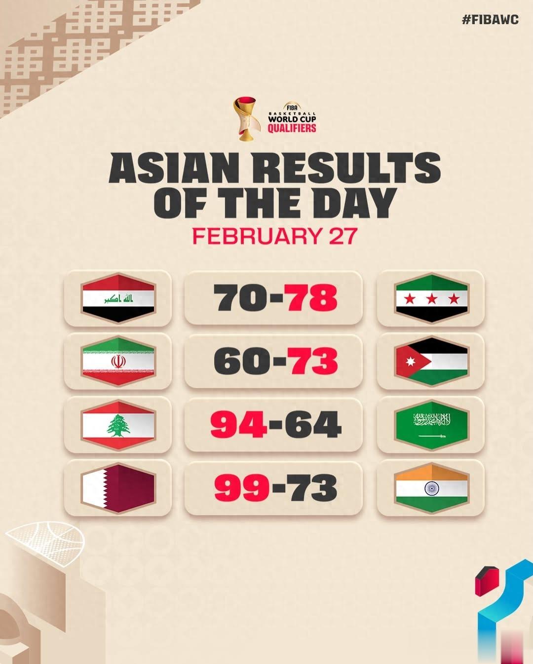 黎巴嫩94-64战胜沙特,黎巴嫩球员阿拉基砍下18分3篮板5助攻,归化球员效力于CBA新疆男篮的戴德里克-劳森砍下17分13篮板6助攻。