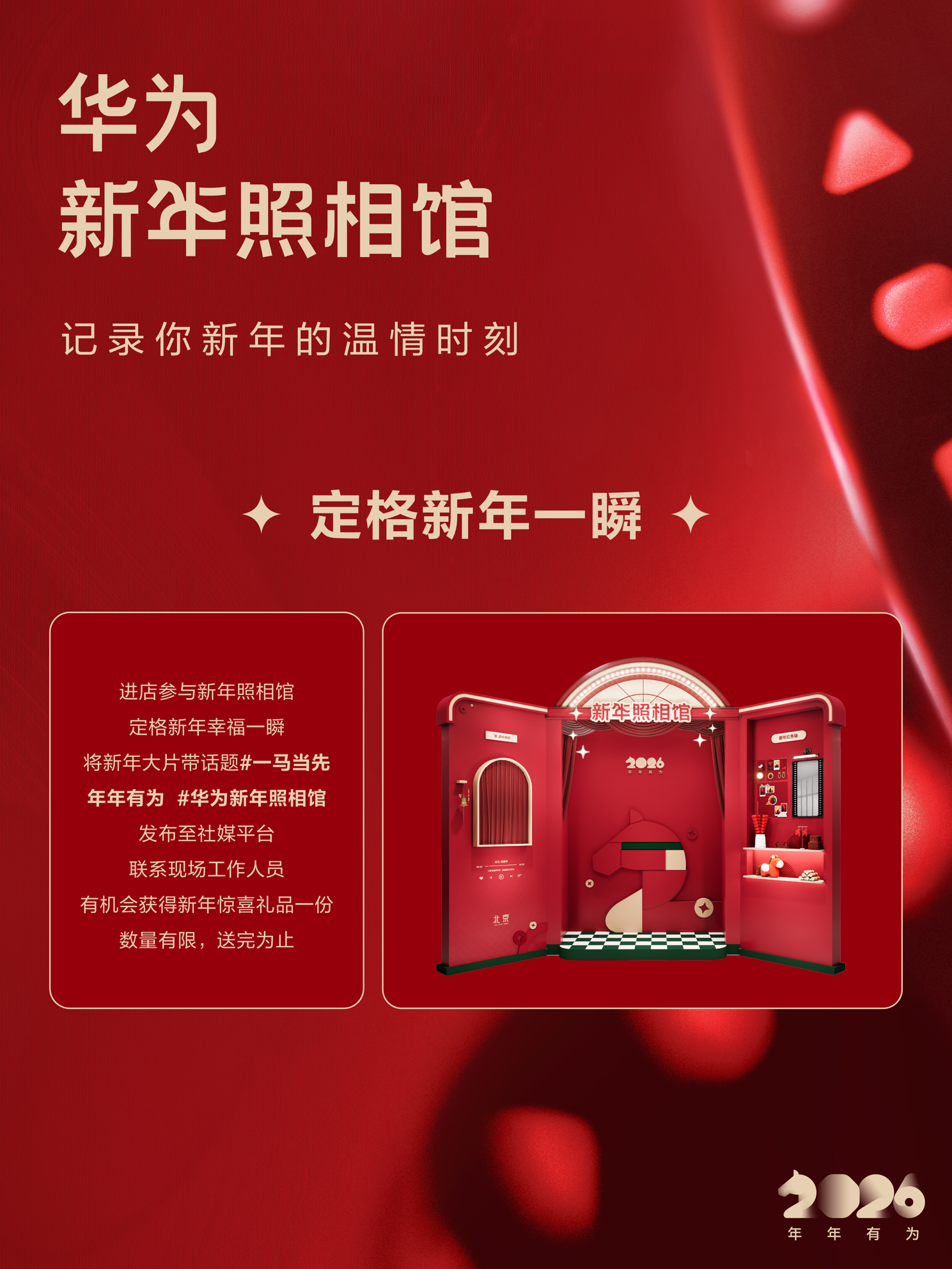 1月21日,华为发布海报官宣,2026年1月24日起“新年照相馆”在全国陆续开馆,用户可以到“我的华为app”查看活动场次并进行报名,解锁“新年第一张写真“创意玩法,深度体验产品与鸿蒙生态的功能,惊喜连连。