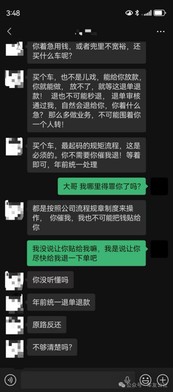 徐先生告诉车友公社,随着退款期限临近,其反复催促退款,对接销售人员的态度急转直下,甚至在沟通中出言不逊。“当时是电话沟通,没有录音,无法提供直接证据,但这种态度让我对花生好车这个平台彻底失去了信任。”徐先生无奈说道。