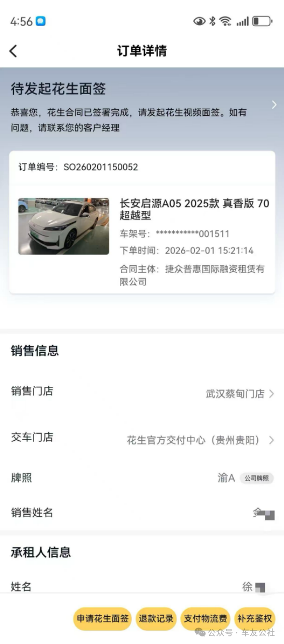 徐先生告诉车友公社,其计划订购一辆启源A07新车,从短视频平台花生好车的引流信息入口,他联系到了武汉区域的花生好车销售人员并交纳了2999元定金。然而,当他登录花生好车APP查看订单时却发现,显示的车辆并非其选定的启源A07新车,而是一辆二手启源A05。“我咨询了花生好车后台工作人员,对方告知该车辆登记在花生好车(捷众普惠国际融资租赁有限公司)的名下,是属于花生好车的车辆。”