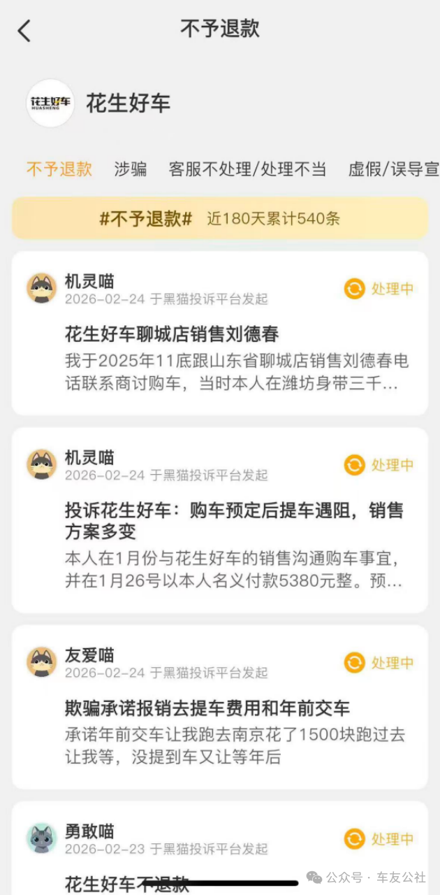 车友公社在调查核实过程中发现,徐先生的遭遇并非个例。黑猫投诉平台数据显示,近半年内,仅标注“不予退款”的相关投诉就累计达540条。