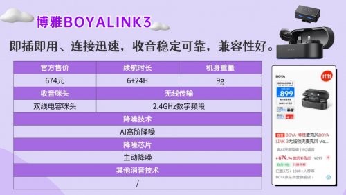博雅BOYALINK3是2025年推出的支持真AI降噪的无线领夹麦克风,单个发射器重量仅9g,磁吸背夹设计方便隐蔽佩戴,适合采访或新闻采集。支持2发4收模式,最多可互联8台设备同步录制。麦克风提供EQ调音功能,可自定义高、中、低频参数,采样规格为48kHz/24bit,信噪比85dB,视距内传输距离可达300米。单次续航6小时,搭配1500mAh充电盒后总续航30小时,接口覆盖Type-C与Lightning,可通过BOYA Central App调节录音模式、增益及降噪等级。BOYALINK3在多设备连接、降噪处理及长时间录音方面表现出色,是注重灵活操作与稳定收音的用户选择。