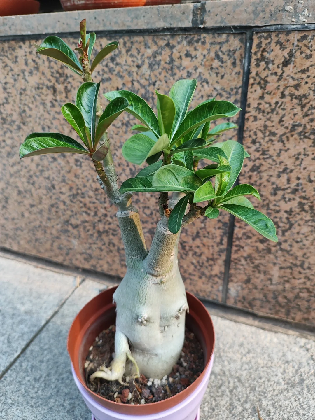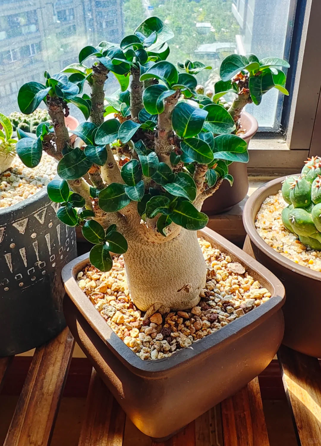沙漠玫瑰虽然具备开花的能力,长得娇艳,但实际上和仙人掌一类的植物差不多,都十分的耐旱,自身可以储存大量的水分和养分,并不适合富养。