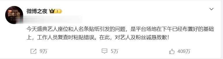 致所有关心微博之夜的朋友们: 首先, 就2月5日微博之夜活动中因座位人名条粘贴失误所引发的争议,我们向所有受到影响的艺人和粉丝朋友,以及所有关注本次活动的观众朋友,郑重致歉。 2月5日下午2点左右,现场座位及人名条已按既定方案准确布置完毕。然而,在后续复核过程中,因中岛二排座位存在空缺,工作人员操作失误,错误将肖战先生及部分座位人名条进行了外移的调整动作,导致人名条位置发生变化。发现问题后,平台工作人员在活动进行期间第一时间予以了纠正。 整个过程,杨幂女士及团队未参与、亦未干预任何座位安排及人名条的设置,相关网传信息均不属实。 对此,我们真诚地向肖战先生、杨幂女士及所有受到影响的艺人和粉丝朋友表达最深的歉意。未来,我们将强化细节管控,杜绝类似问题再次发生。