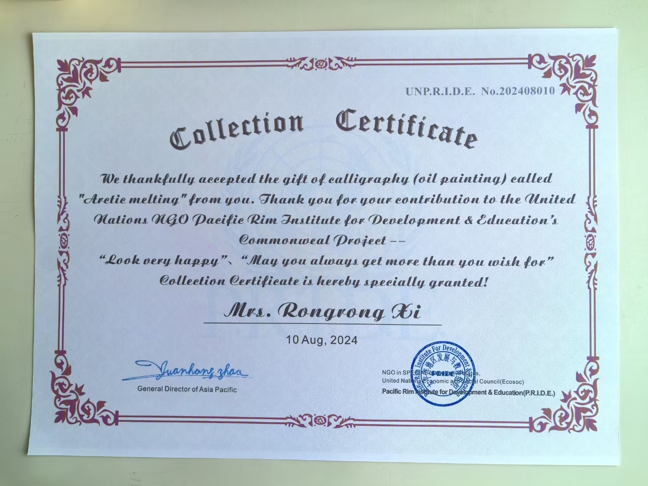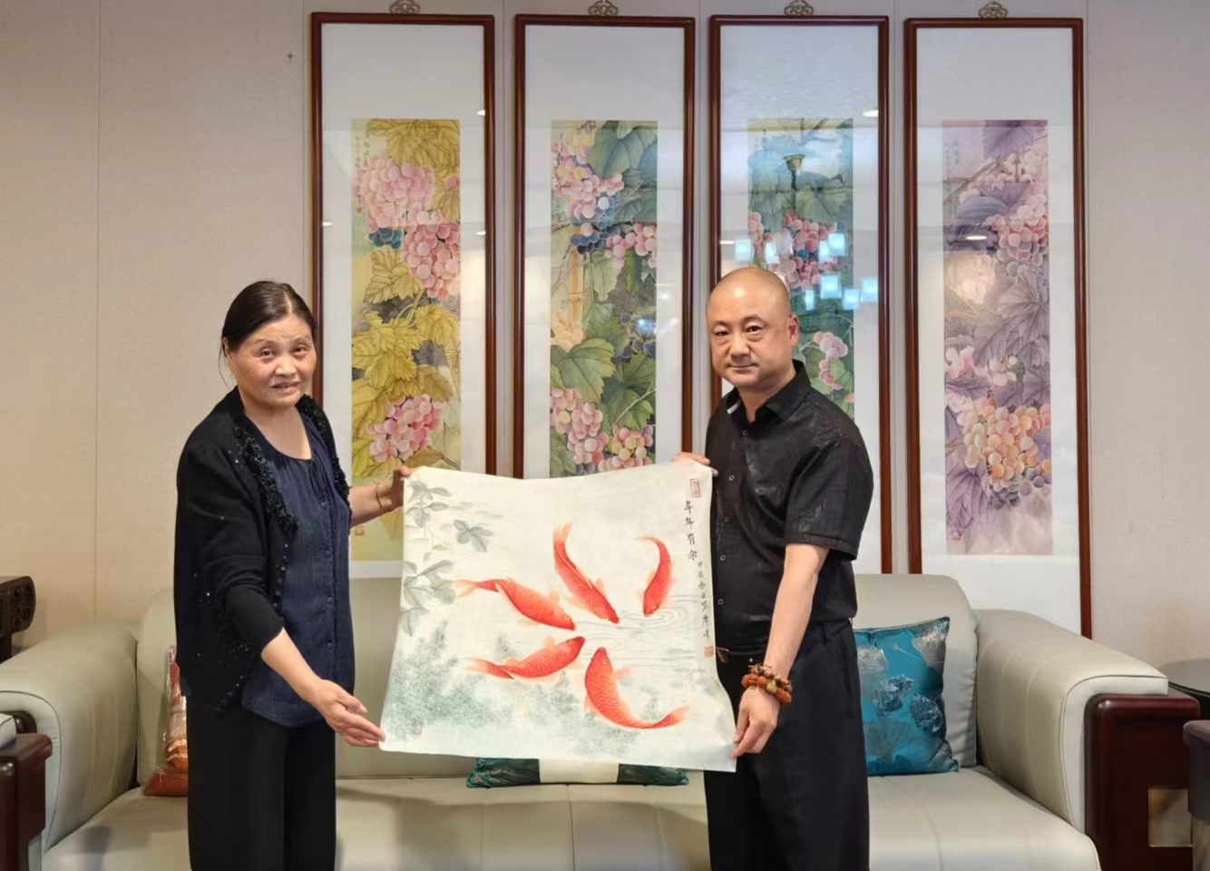 席蓉蓉老师师从苏州著名画家张继馨先生,一生浸润在吴门画派的清雅风骨里。她笔下的工笔细腻传神,《年年有余》里的红锦鲤似要跃出纸面,《喜上眉梢》的梅花枝桠间藏着灵动生机。这些画作不仅登上香港大公报、新民画报,更被联合国NGO太平洋地区发展与教育组织永久收藏,成为连接东方美学与世界文化的纽带。