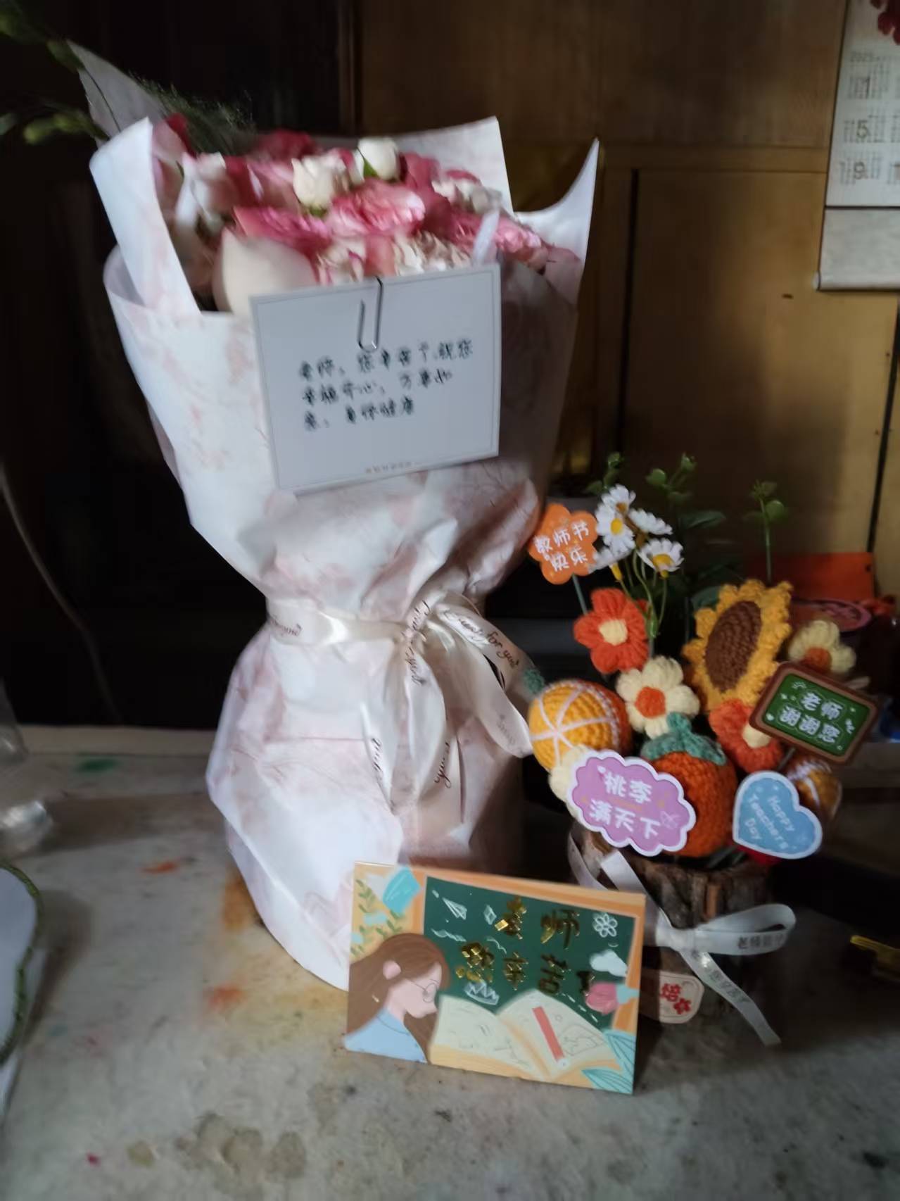 当粉白相间的花束被递到面前,当钩织的向日葵上“桃李满天下”的牌子轻轻晃着,席蓉蓉老师的眼眶悄悄湿润了。她总以为孩子们还不懂她伏案改画的疲惫,不懂她为了《友城绘》奔走书店的奔波,可这束花、这张写着“老师辛苦了”的卡片,却替孩子们说出了所有懂得。那些藏在稚嫩笔触里的感激,那些悄悄记下的温柔瞬间,此刻都凝在花瓣与绒线里,让所有疲惫都在暖意里消散。