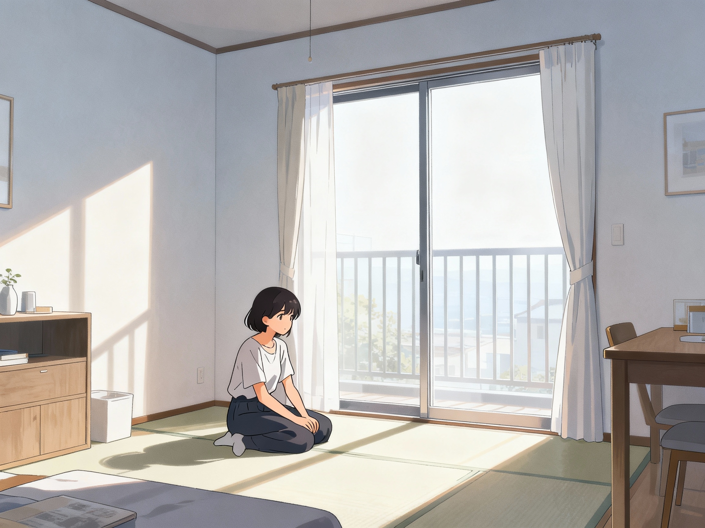 落地窗旁,女人独自坐在装修简单的房子里,窗外白天、黑夜轮换,屋内光线一起变化。光线从落地窗照进来,女子位置固定不变,将她的影子拉得修长。