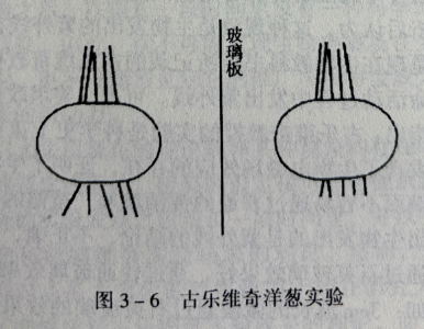 插入普通钾钠玻璃板:发芽信号被阻断,第二个洋葱毫无反应。
