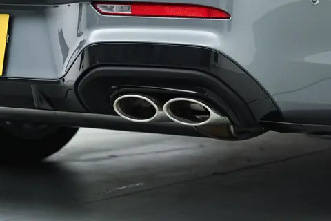 车身侧面是溜背造型,腰线往上扬,看着像往前冲的样子。18 英寸的星芒轮毂,配着红色的卡钳,还有黑色的外装套件,运动感更明显了。车尾的设计延续了这种风格,"小鸭尾" 扰流板、双边共四出的排气尾喉,还有熏黑的扩散器,这些细节加起来,让整车看着更有活力。