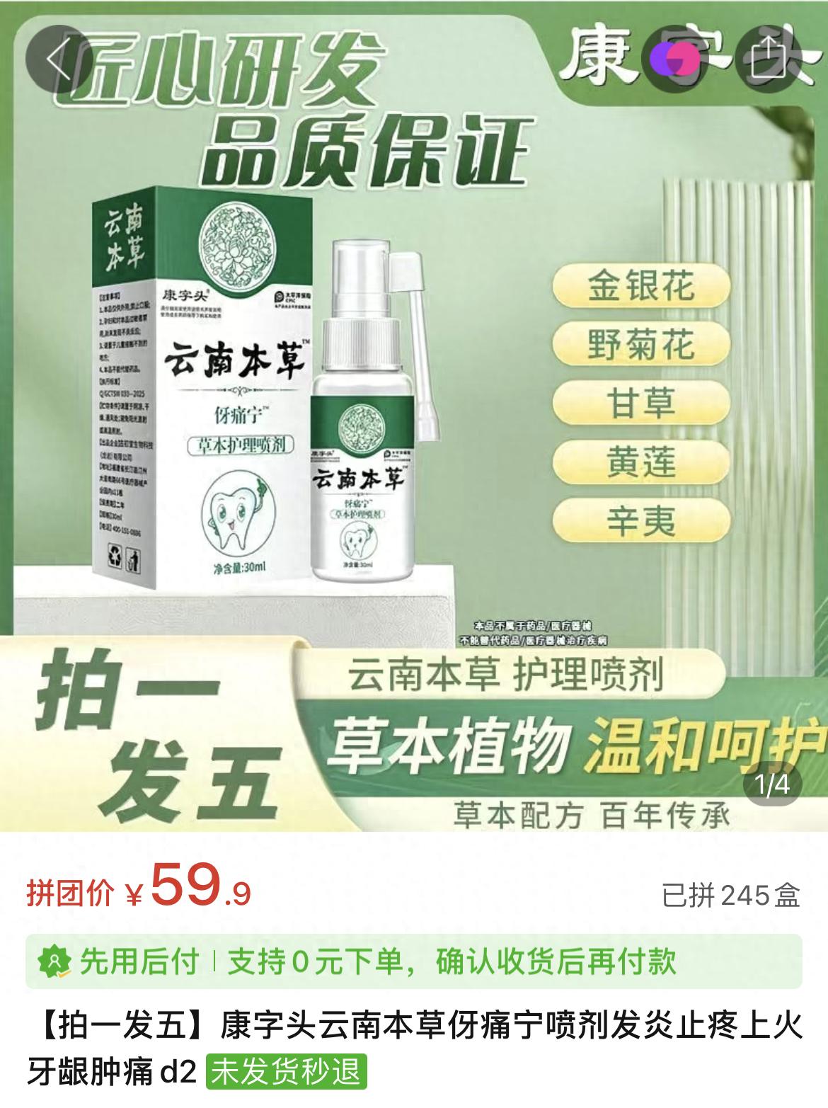 目前,这款“康字头云南本草伢痛宁草本护理喷剂”的售价没有变化,五瓶装售价仍为59.9元。在店铺的产品介绍中,之前宣称能够治疗各种牙痛的视频已经下架。此前在该视频中,提及产品“治多种牙痛问题:吃饭牙痛、喝水牙痛、虫牙蛀牙、吃凉牙痛、牙龈肿痛、牙周炎痛”“我们比牙医更加快捷更加方便,适合随身便携、病发即止”,并称该产品能够“从源头解决牙痛问题”。