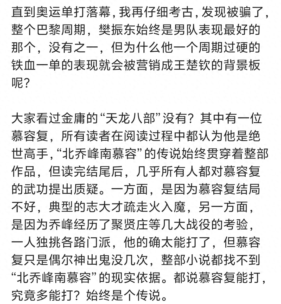 贺晓龙将樊振东跟王楚钦比喻成金庸武侠小说当中的人物,北乔峰和南慕容。乔峰确实在天龙八部当中,一人独挑几大门派,生平难逢敌手。而慕容复被鸠摩智、丁春秋和段誉给打败,综合水平跟乔峰还是有区别的。慕容复综合水平究竟有多强,很多武侠迷是存疑的。