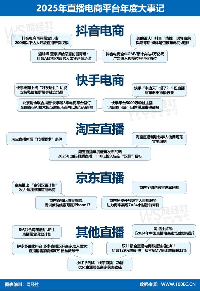 2025年,抖音凭借巨大规模效应与行业影响力,持续调整规则并应对AI盗播等新挑战;快手面对头部主播震荡,强化合规与社交功能;淘宝直播与京东则分别锚定“品质”与“低价+技术开放”战略,寻求差异化竞争。同时,跨平台合作、AI治理规范成为行业新焦点,显示市场在高速扩张中正走向更规范、融合与多元的发展阶段。岁末年初,网经社第17次例行启动电商与互联网【年终盘点】系列计划。这不仅仅是对过去一年大小事件的简单罗列,更是一次基于专业洞察的年度复盘与趋势预判。助您把握商机,携手共创行业影响力。