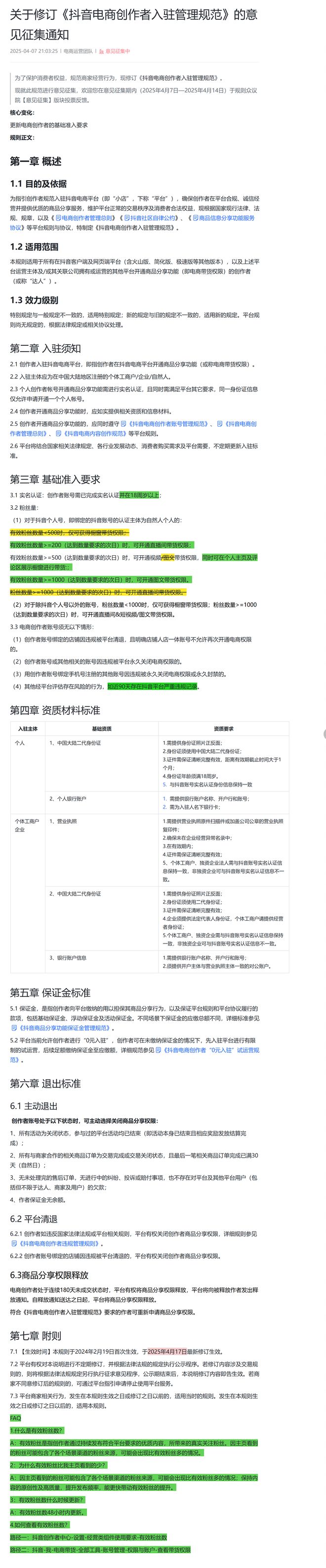 4月7日,抖音电商发布《关于修订〈抖音电商创作者入驻管理规范〉的意见征集通知》,对电商创作者的带货权限规则进行重大调整,首次将个人与非个人账号的带货权限与粉丝量分级挂钩。