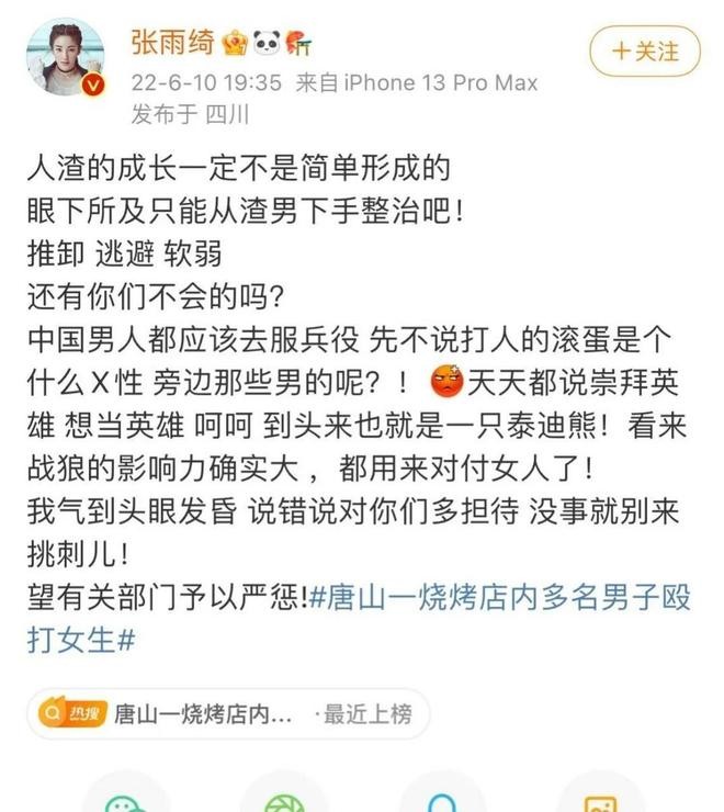 回溯唐山烧烤店打人事件,张雨绮抛出“中国男人都该去服兵役”、“男人连泰迪熊都不如”等极端观点。她看似为女性发声,实则刻意挑起性别对立博取流量。