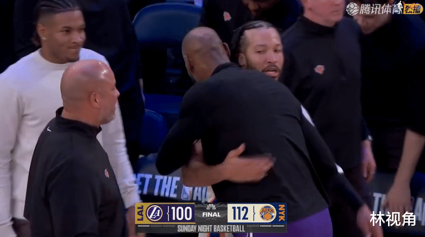 比赛结束,老詹大步走到尼克斯替补席,一把抱住布伦森,拥抱致意,之后和尼克斯球员逐一拥抱,显得非常友好。