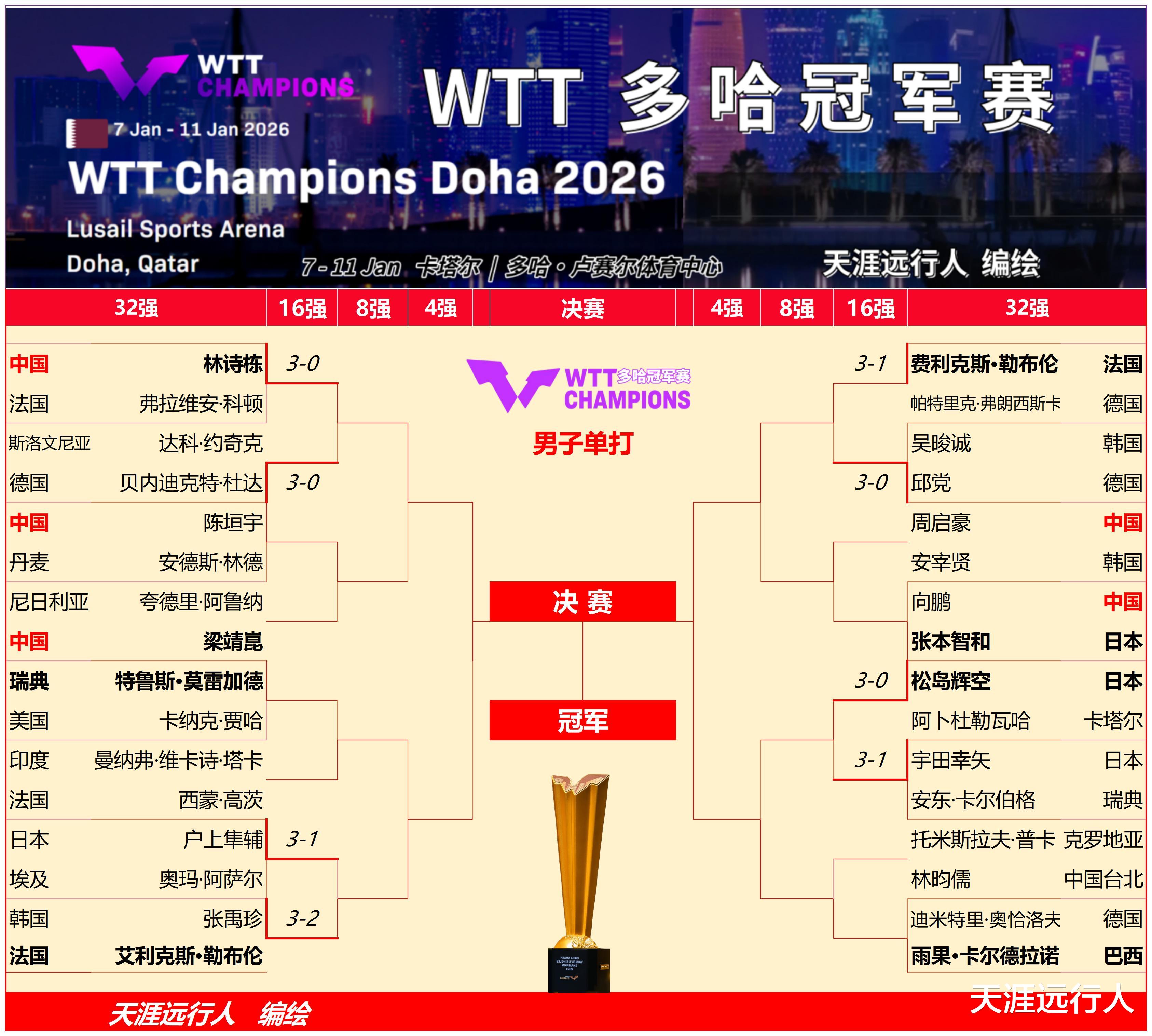 北京时间1月8日凌晨3时04分,2026世界乒联WTT冠军赛多哈站首轮首日,32进16轮次前半程,男女单打各八场角逐,全部分出了高下,赛会男女单打16强各产生八席。