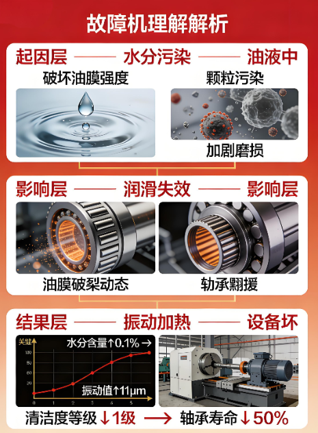 水分影响:油中溶解水与游离水破坏油膜强度,引发润滑失效与微点蚀;