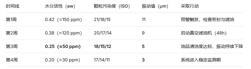 处置流程化:预警触发后,系统推荐处置措施(如滤油、换滤芯、检查密封);