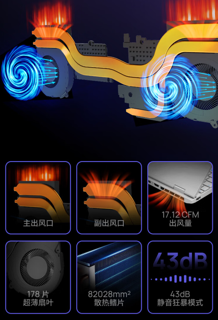 高效散热+静音控制,长时间使用更舒适。高性能的持续释放离不开优秀的散热系统,翼龙15Pro 2026采用双风扇后出风设计,搭配三热管3D贯穿式设计与霍尼韦尔相变硅脂,17.12cfm出风量+178片超薄扇叶+82028mm²散热鳍片,能快速带走核心硬件产生的热量,确保高负载运行时机身不烫手、性能不衰减。其中霍尼韦尔相变硅脂常温下为固态,温度升高后会逐渐软化,导热效果出色且质价比高,相较于普通硅脂能更好地维持散热稳定性。