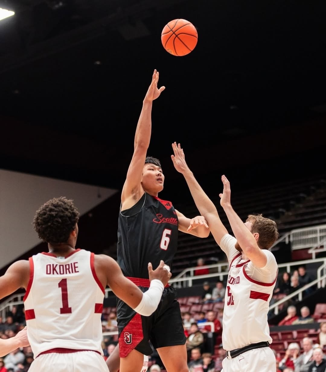 12月20日NCAA常规赛,西雅图大学70:66华盛顿大学,淡厚然替补出场8分钟,拿下9分2篮板2盖帽 ,打的很高效,但上半场两次不必要的犯规,限制了他的出场时间。