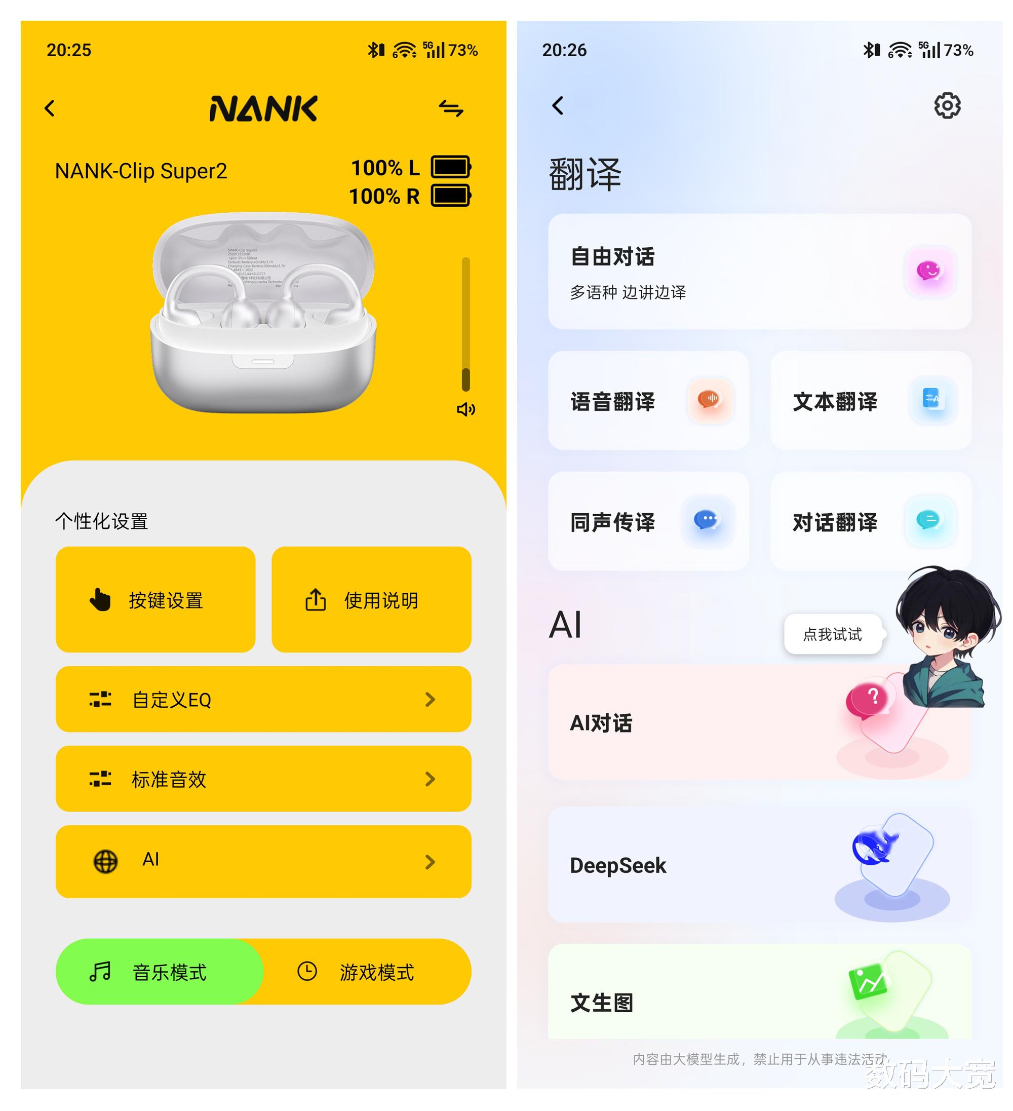 除此之外,南卡APP也增添了一部分可玩性,除了常规的按键功能自定义、均衡器之外,也接入了当下流行的AI大模型,通过耳机收音就能实现语音翻译、同声传译,以及AI对话等趣味功能。