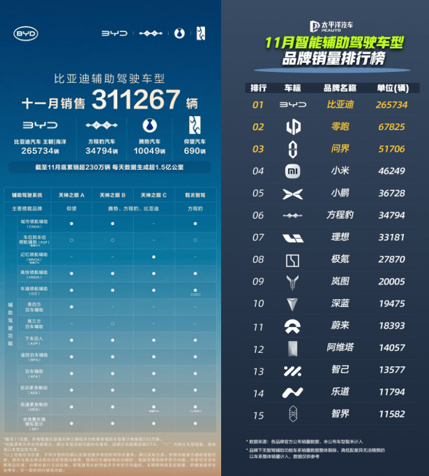 近日,比亚迪公布了其搭载天神之眼辅助驾驶系统的车型在11月的销售数据,全月销量达311267辆,继续引领市场。其中,比亚