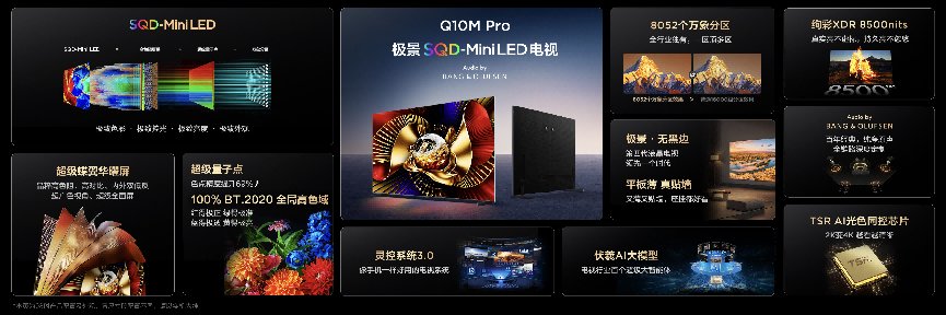 价格方面,Q10M Pro 98吋31999元、85吋21999元、75吋16999元、65吋11999元;Q10M同样搭载SQD-Mini LED核心技术,配备超级量子点与超级蝶翼华曜屏,98吋24999元、85吋15999元、75吋12999元、65吋9999元,于1月5日开启预售,1月15日正式开售。