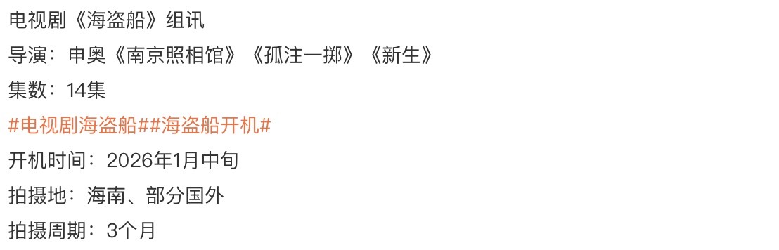 网传由申奥操刀的硬核大剧《海盗船》已进入开机倒计时,预计2026年2月正式启拍。