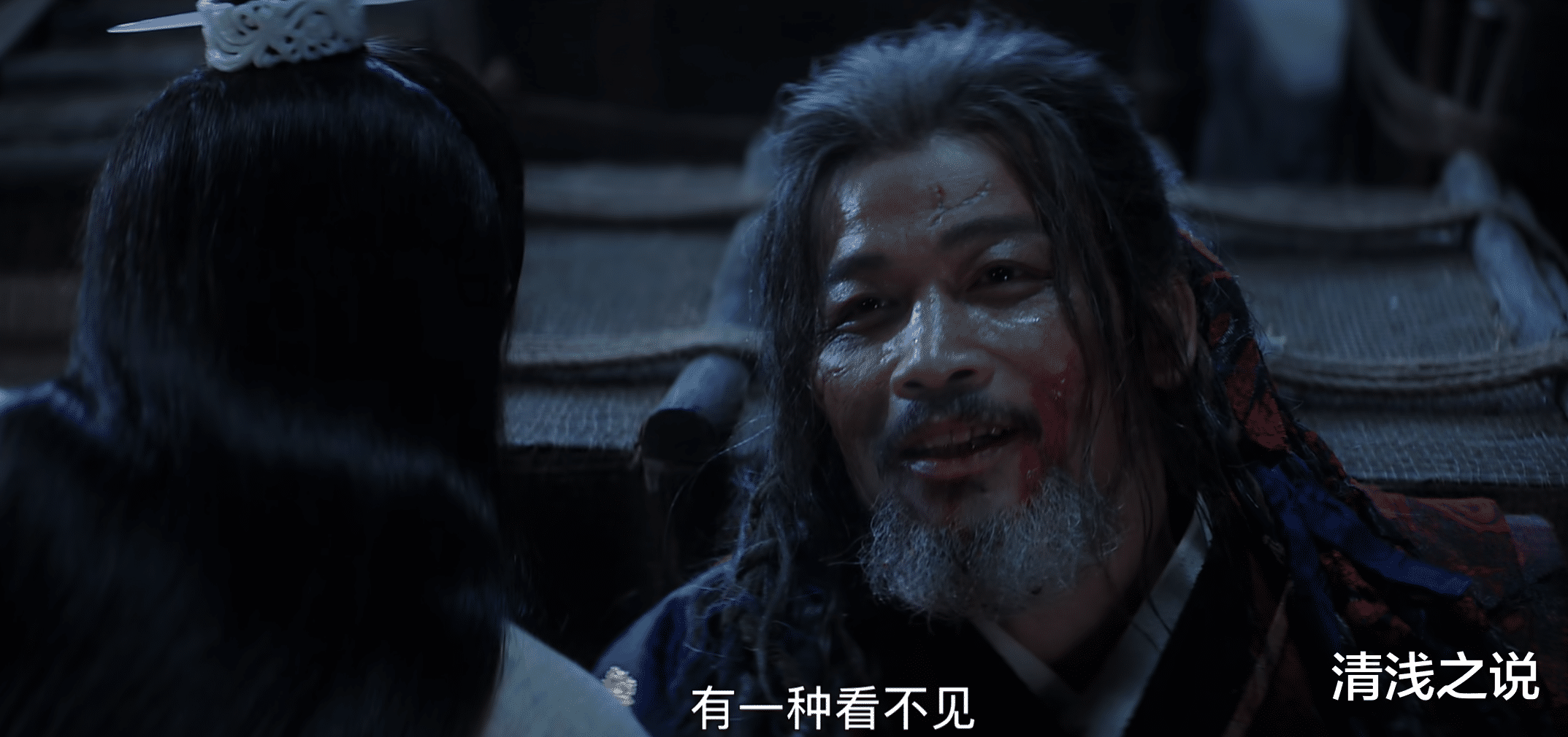被刘子言划了几刀,自知命不久矣的蒲逆川最牵挂的是小酒馆的老板娘,很想知道谢淮安究竟对老板娘说了什么,能让老板娘对着他笑。此时的谢淮安原谅蒲逆川了,说“有一种看不见摸不着的东西在你我之间,你猜它是什么?是缘分。”前面的问句是蒲逆川对老板娘说过的话,答案是蒲逆川一直想要的。或许谢淮安对老板娘说的是别的话,但他宽恕对方了,为让对方没有遗憾地走,宁愿说谎。又或许蒲逆川也知道谢淮安骗他,但这番善意的谎言说明对方不恨自己了,自己快要死了,何不顺着那美丽的谎言去想象,也就微笑着走了。