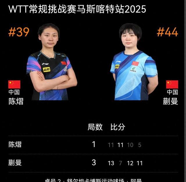 北京时间2025年1月16日向,WTT常规挑战赛马斯喀特站,单打四强已出部分名单,国乒内战蒯曼3:1陈熠晋级四强,日国乒内战大藤沙月3:0横井咲樱,晋级四强,半决赛将和蒯曼交手,上一场球星挑战赛两个人刚交手过,大藤沙月败给了蒯曼,男单陈垣宇3:0玛纳什·沙,顺利晋级四强。