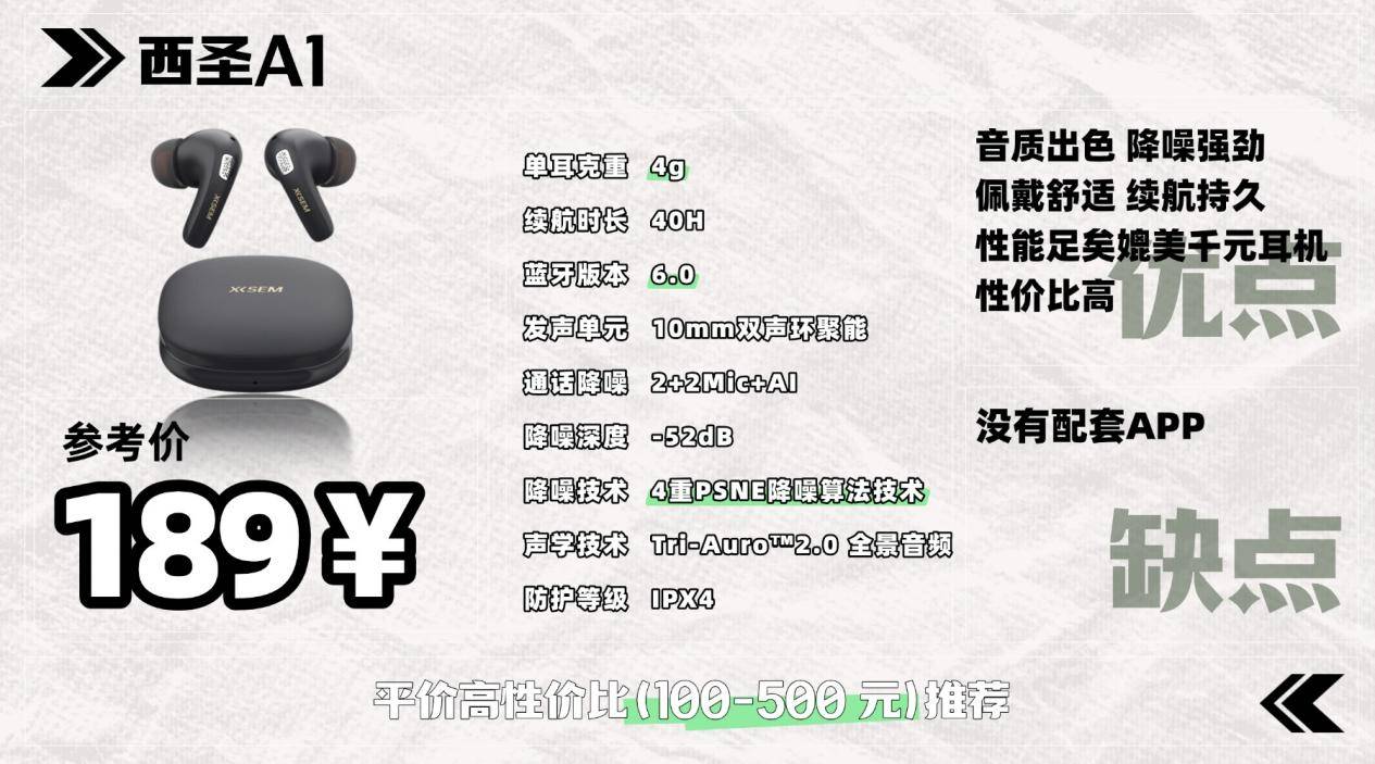 从硬件方面来看,西圣A1配置直逼千元旗舰,它核心用料上直接下放千元级高端材料AeroSilk™钛晶复合振膜,结合10mm双声环聚能声音单元、旗舰级N48强力钕磁铁以及Tri-Auro™ 2.0全景音频矩阵等先进技术,在多重技术的加持下使得听歌变得非常享受,声音解析力提升高达87.5%,动态响应速度提升82%,同时高频保真率达到96.7%,实现了媲美千元HiFi耳机的音质还原度,而且还获得了权威专业测评师以及国内外专业音质检测机构的评选,被评为年度音质性价比蓝牙耳机品牌。
