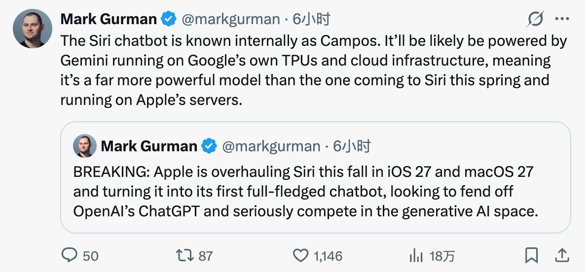 马克·古尔曼称,Siri聊天机器人的内部代号为“Campos”。它很可能由运行在谷歌自家TPU和云基础设施上的Gemini驱动,这意味着它比今年春天即将推出的、运行在苹果服务器上的Siri要强大得多。