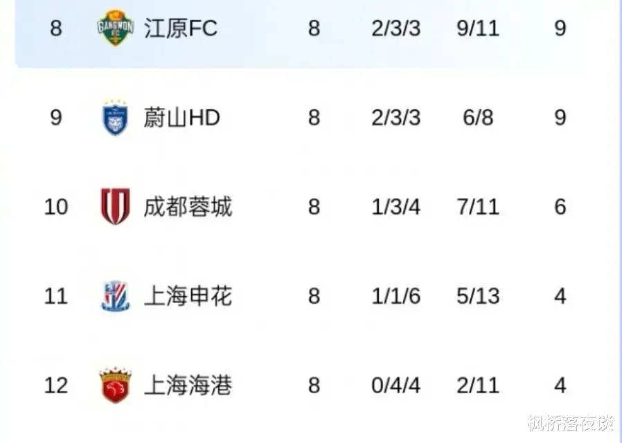 把目光投向整个亚冠积分榜:上海申花1胜1平6负积4分,成都蓉城1胜3平4负积6分。中超BIG3,合计仅取得2场胜利,包揽东亚区倒数前三。