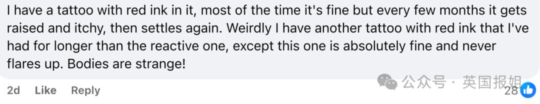 “我有个红色墨水的文身,大多数时候都没啥问题,但每隔几个月就会凸起发痒,然后又恢复。奇怪的是我另外一个文身里面也有红墨水,但这个就从来没问题。人的身体很奇怪!”