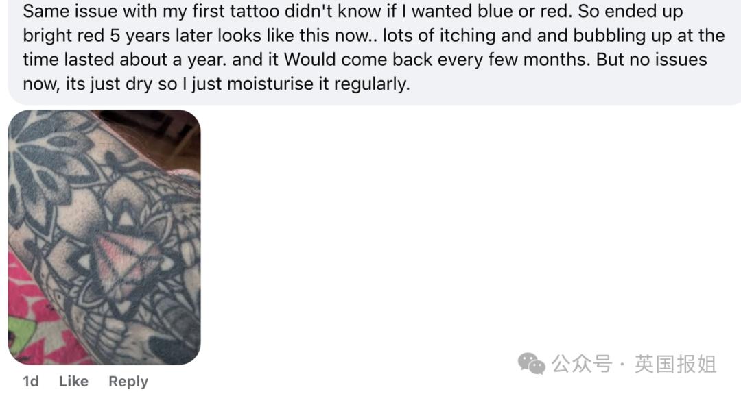 “我第一个文身也有这种情况,当时我不知道要蓝色还是红色,最后选了亮红色。这是5年后的样子,当时文身又痒又肿持续了大概一年,之后每隔几个月又会有症状。但现在好了,只是皮肤比较干,所以我定期保湿。”