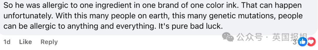 “所以他是对某个文身墨水品牌里的一个颜色中的一个材料过敏吧。很不幸这种情况确实会发生。地球上那么多人,基因突变又多,人就是可能对啥都过敏。纯纯倒霉。”