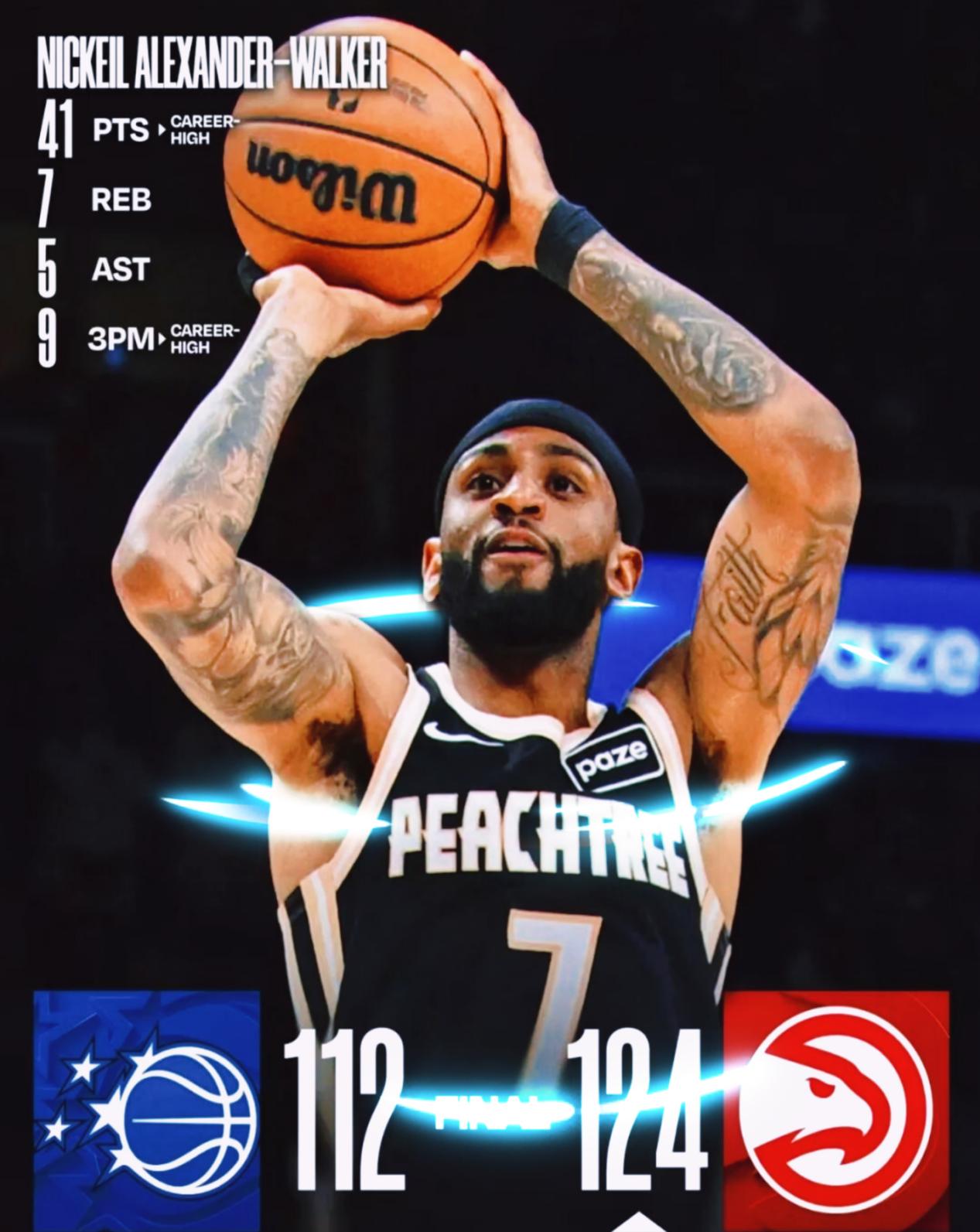 沃克高效砍下全场最高 41 分(他和雷霆的亚历山大是表兄弟),