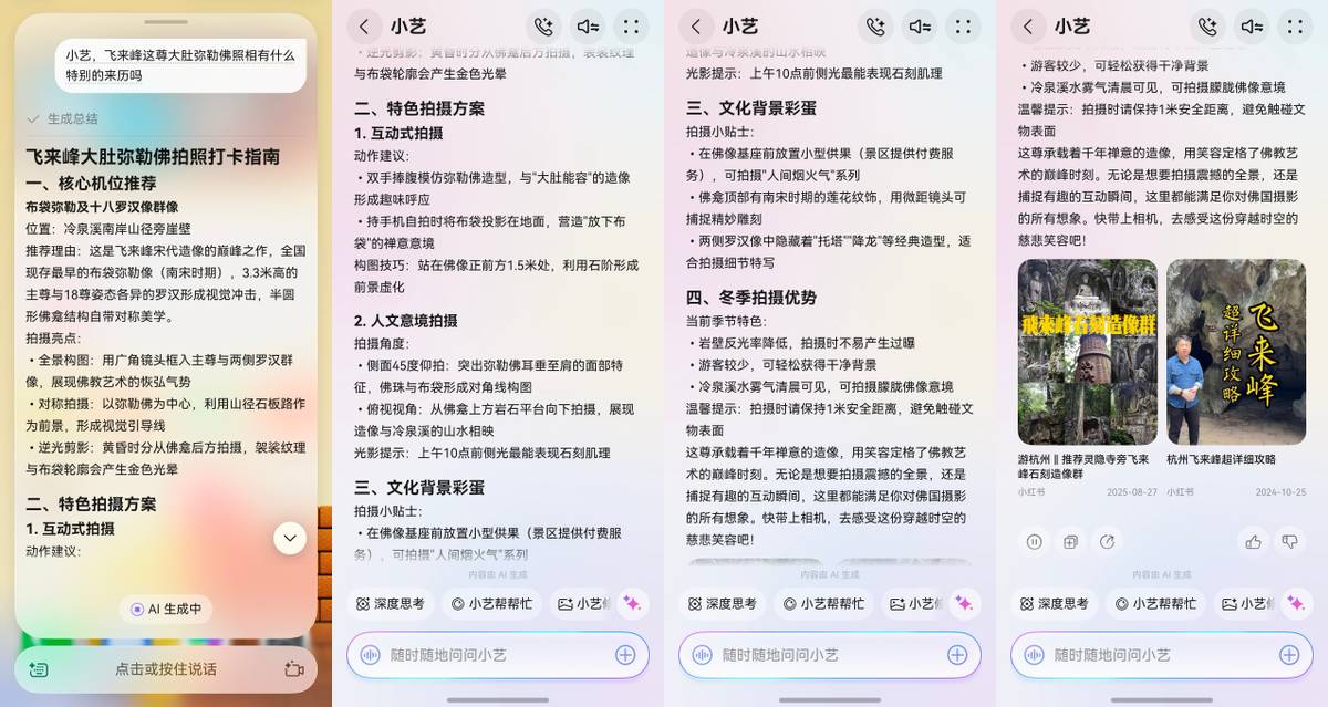 去灵隐寺那天人特别多,蹭旅行团的讲解也听不清。我索性就离人群远点,自己慢慢看。看到飞来峰的造像,有些好奇背后的故事,就抬起手机问了一句:“小艺,飞来峰这尊大肚弥勒造像有什么特别的来历吗?”我本来以为就是个百科式科普,结果它反而慢条斯理地开始娓娓道来,说是飞来峰宋代造像的巅峰之作,全国现存最早的布袋弥勒像,甚至还给出了拍摄方案和小红书攻略笔记。那一刻感觉真的很哇塞,就像身边多了个知识渊博的朋友,而且问什么答什么,比挤在人堆里听嘈杂的喇叭舒服太多了。