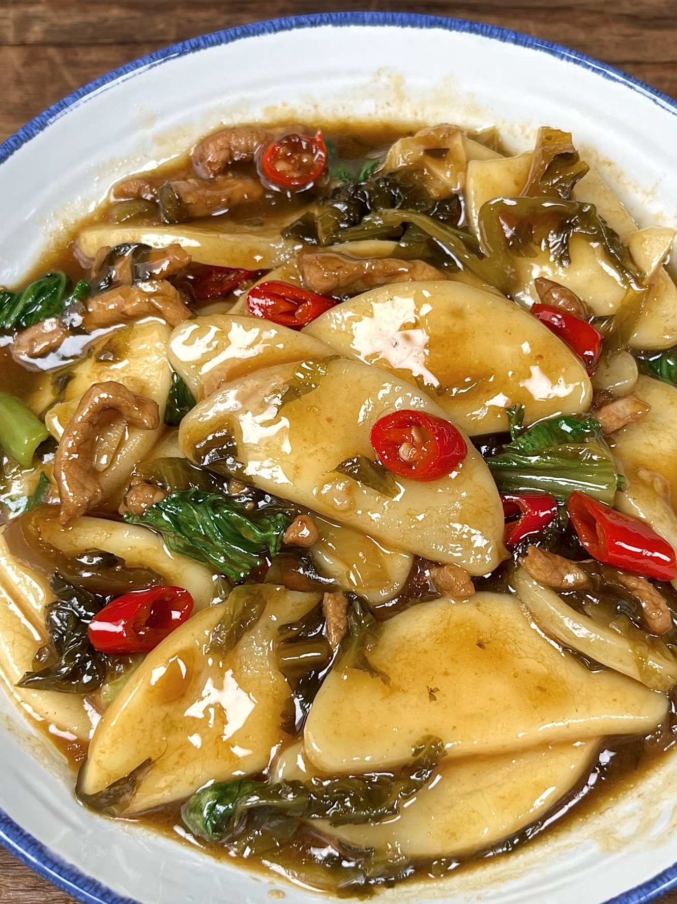 锅烧热,油比平常多一点点,润锅防粘。蒜末+小米辣先下锅,“噼里啪啦”香味炸成烟花,立刻倒入肉丝,大火快速划散,30秒从粉红变雪白,表面锁出亮壳。酸菜碎集体跳水,继续大火炒1分钟,看菜帮从暗黄变翠绿,酸味被热油包裹,香气瞬间翻倍。把年糕条铺上去,淋一圈酱汁,再加半碗热水,汤汁刚没过年糕一半,盖盖子,中火焖2分钟,让年糕“喝饱”酸辣汁,时间千万别过头,否则软到断魂。