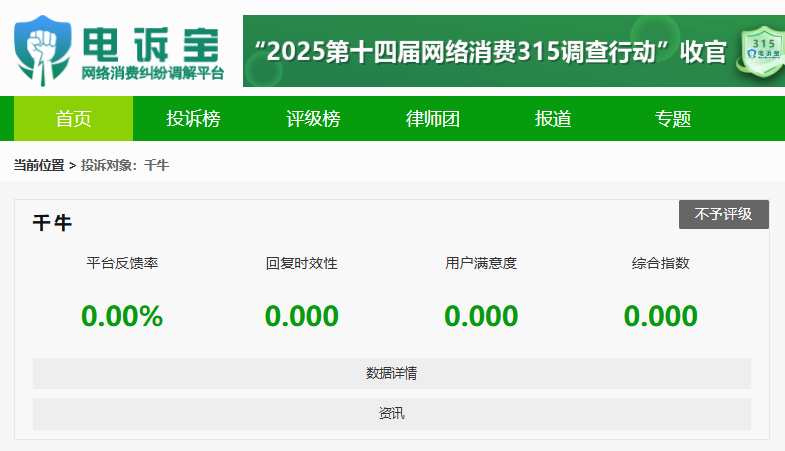 此外,国内网络消费调解平台“电诉宝”受理用户维权案例显示,“千牛”2025年今年至今还涉嫌存在霸王条款、任意罚款、扣押保证金、冻结商家保证金、恶意罚款、任意仅退款、发货问题、过度维护消费者等问题。